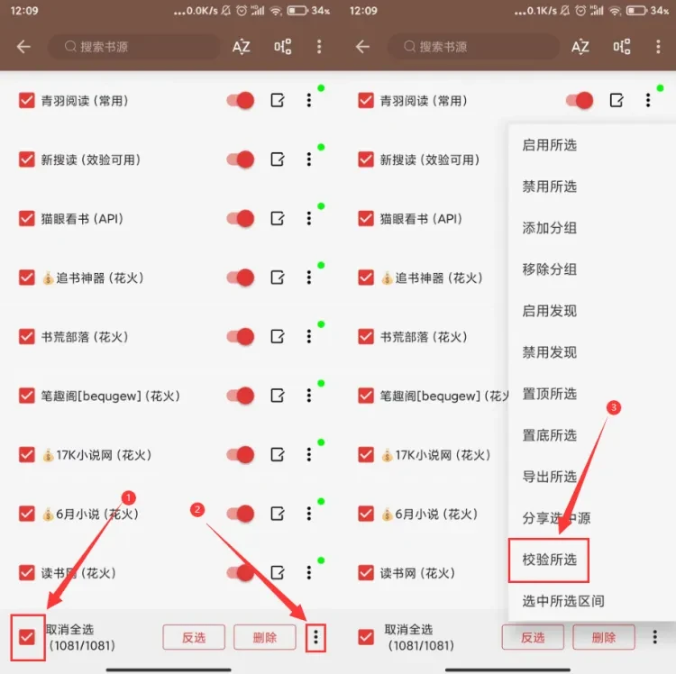 下面说下怎样检测和删除: 还是在书源管理页面,点击全选,再点击右下角的菜单。在唤出的菜单里,再点击“校验所选”,最后再点击确定就会开始检测了。