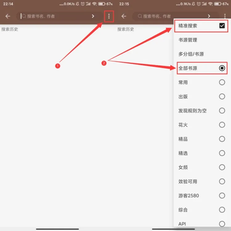 明明已经导入书源,但是搜索时却是什么都搜不到?如果遇到这个情况,可能是软件默认没有勾选书源。解决办法检查下书源是否已勾选,方法:在搜索页面点击右上角菜单,把“精准搜索”勾选上,然后选择“全部书源”。